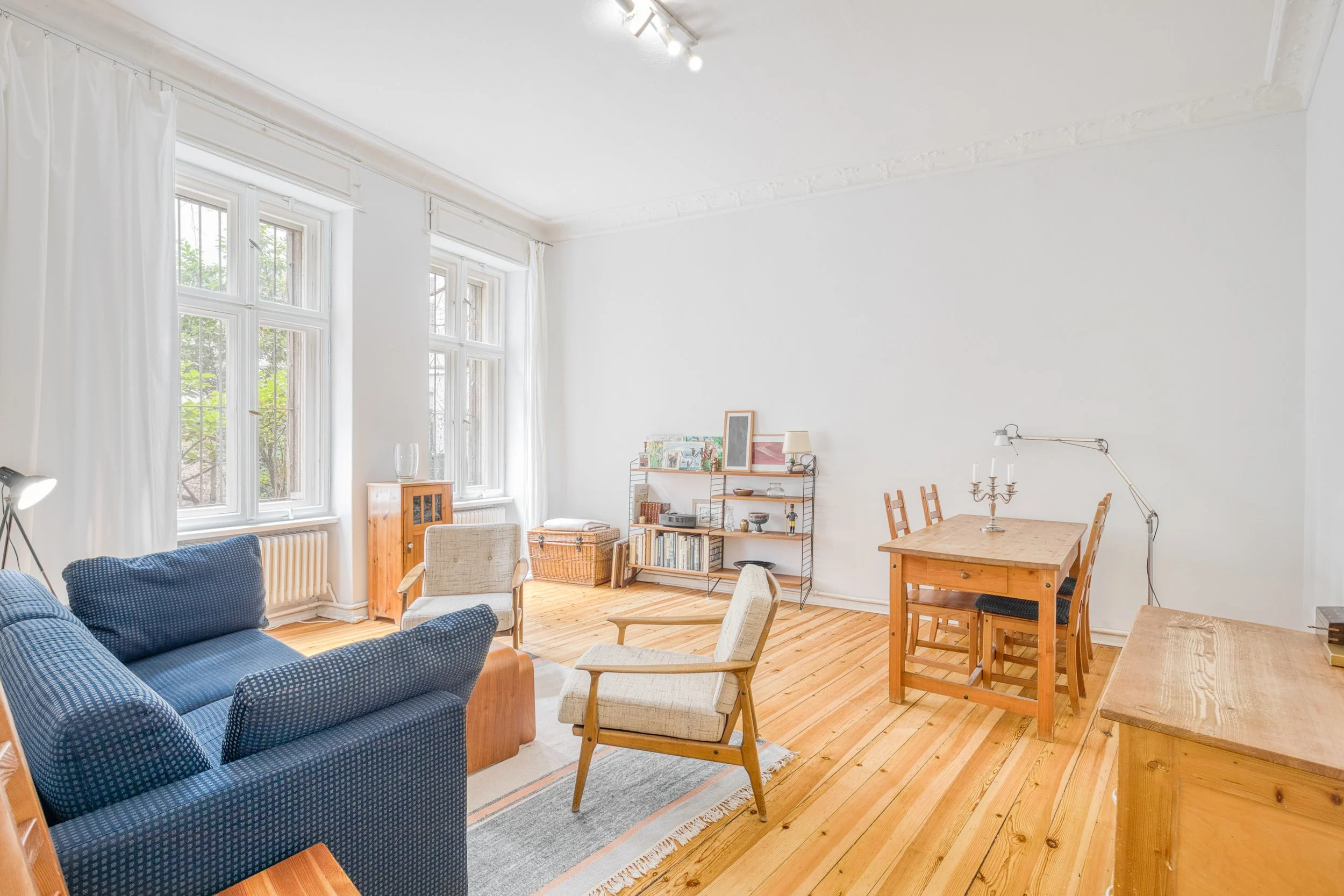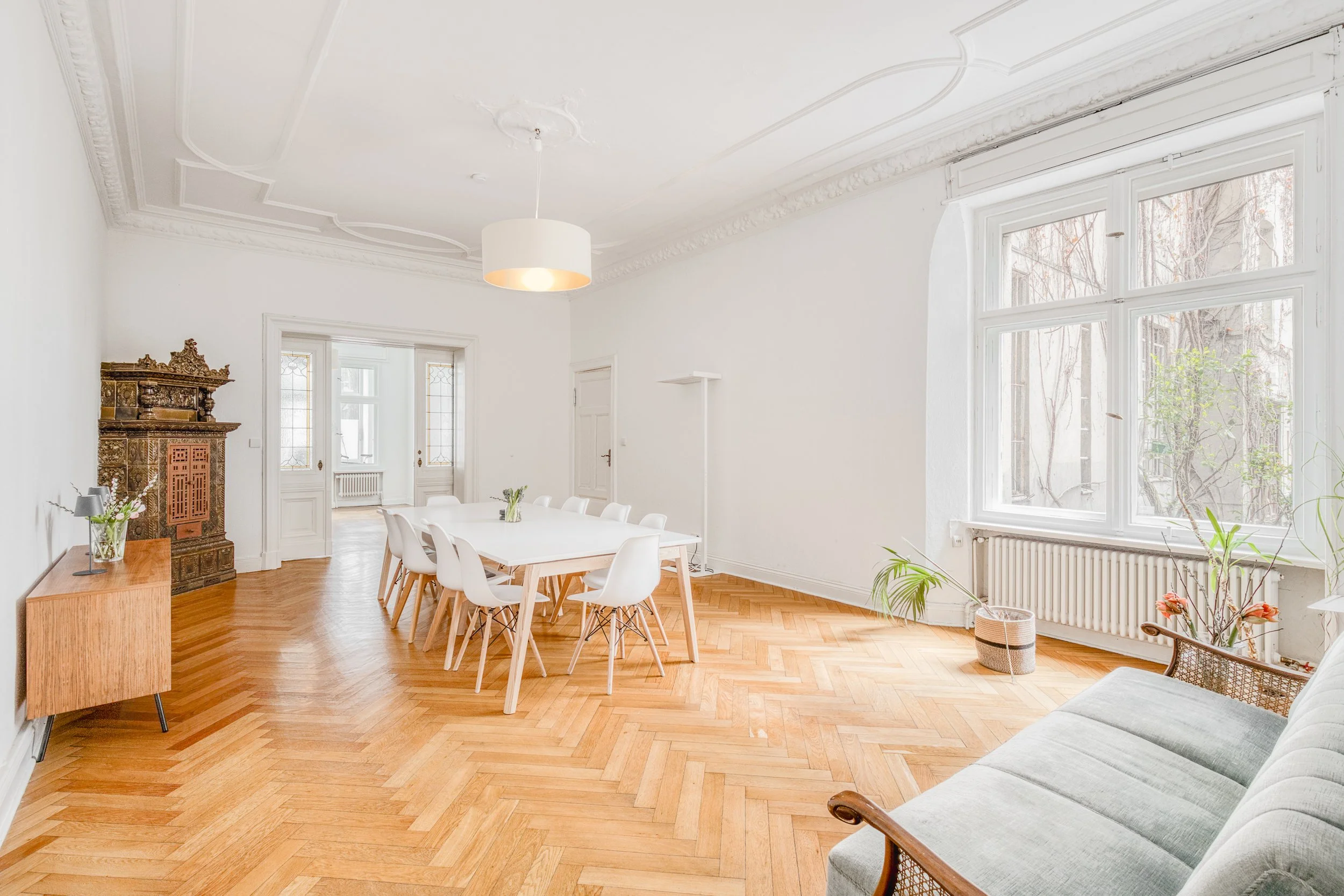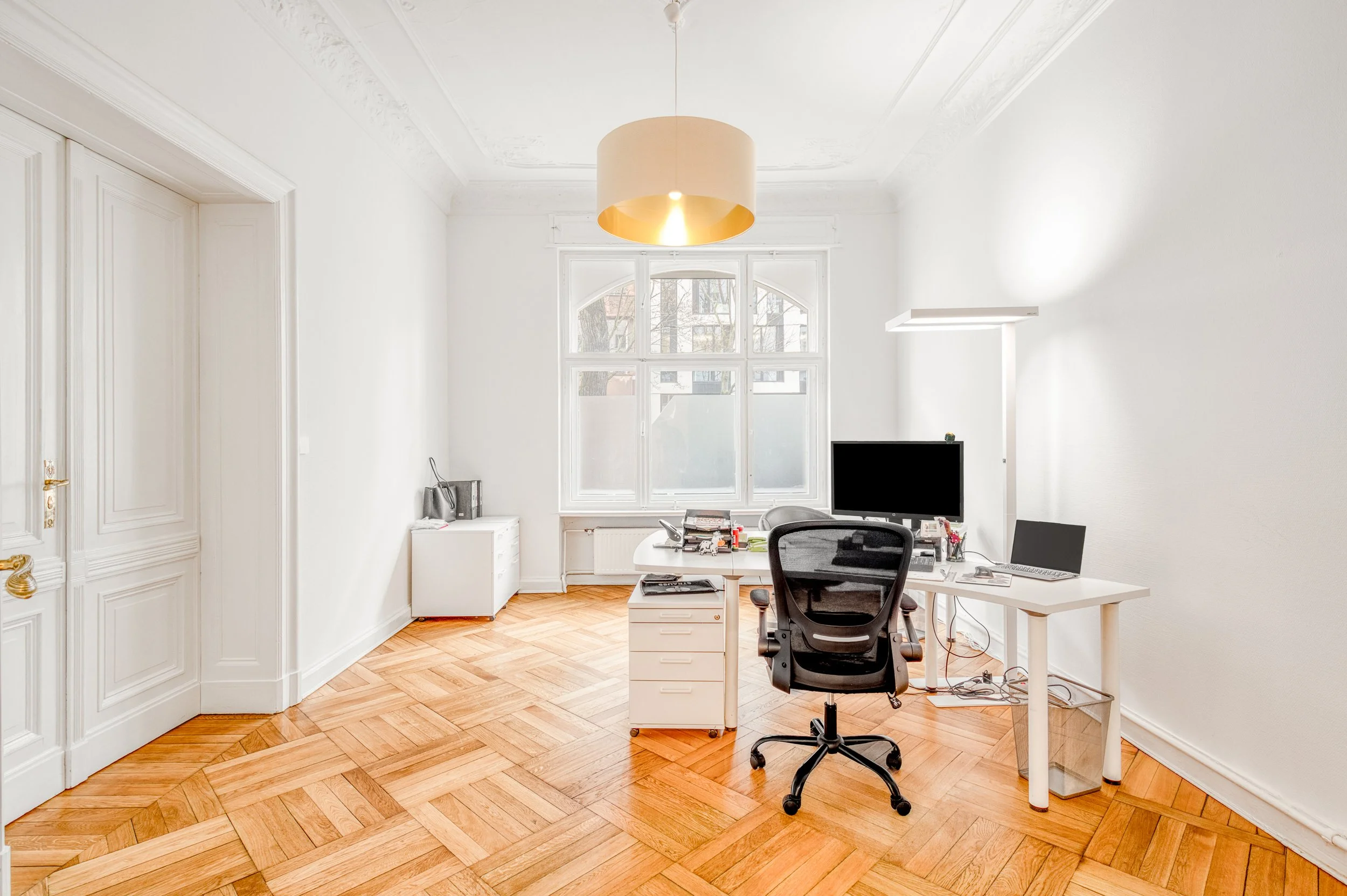 Situated on the ground floor of a striking 1901 Altbau, this impressive main door apartment extends to approximately 186 m² and benefits from approved mixed-use status. It offers exceptional flexibility, whether as an elegant private residence, a commercial space, or a combination of both.
